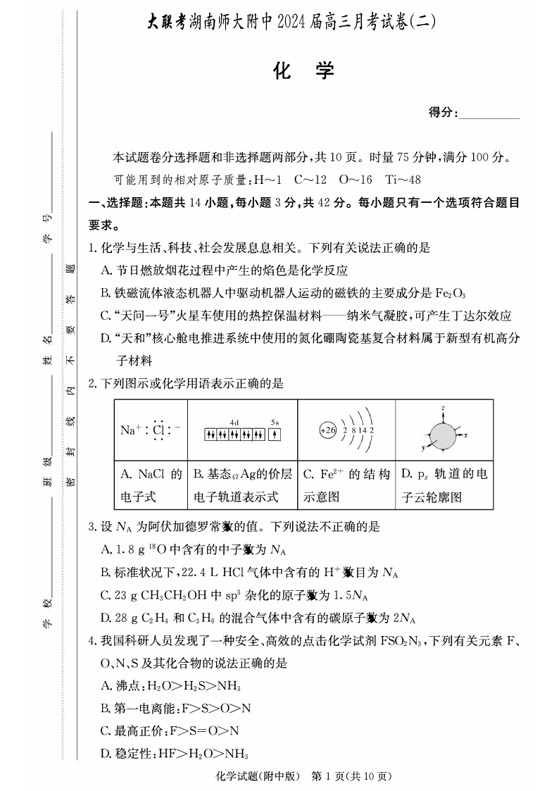 湖南师范大学附属中学2024届高三上学期月考(二)化学+答案