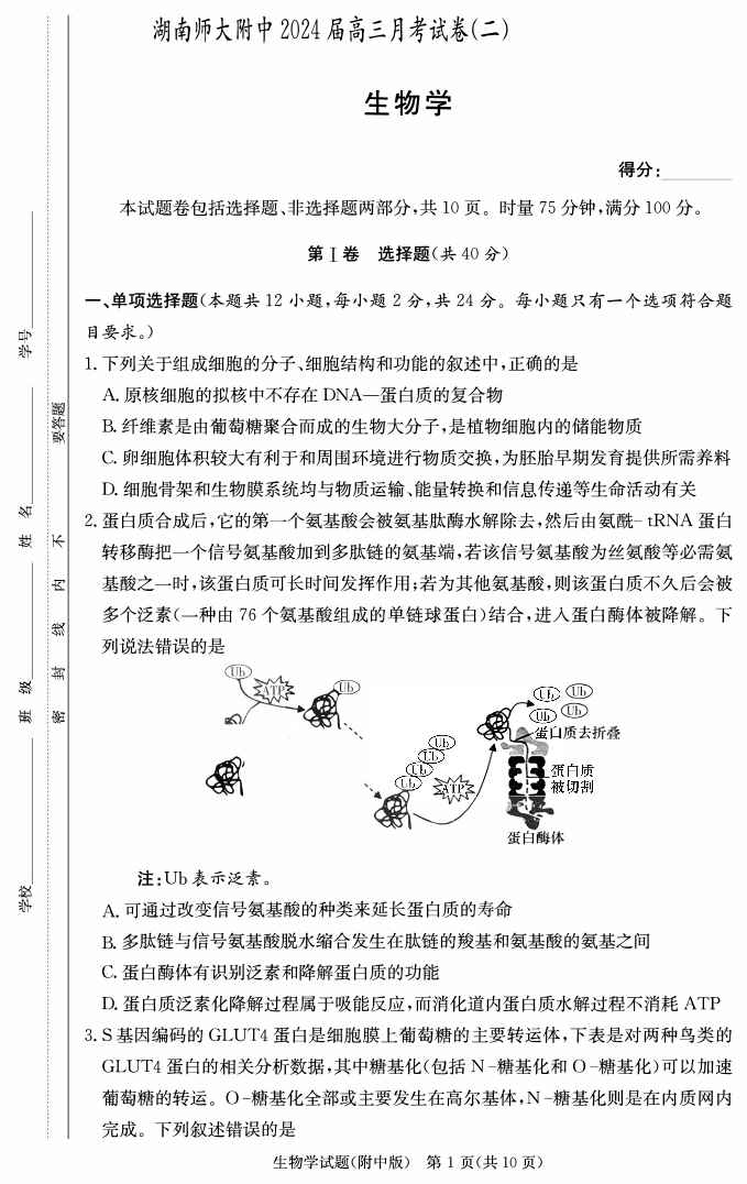 湖南师范大学附属中学2024届高三上学期月考(二)生物+答案