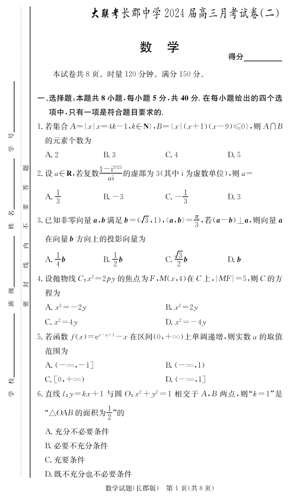 湖南省长沙市长郡中学2024届高三上学期月考卷(二)数学
