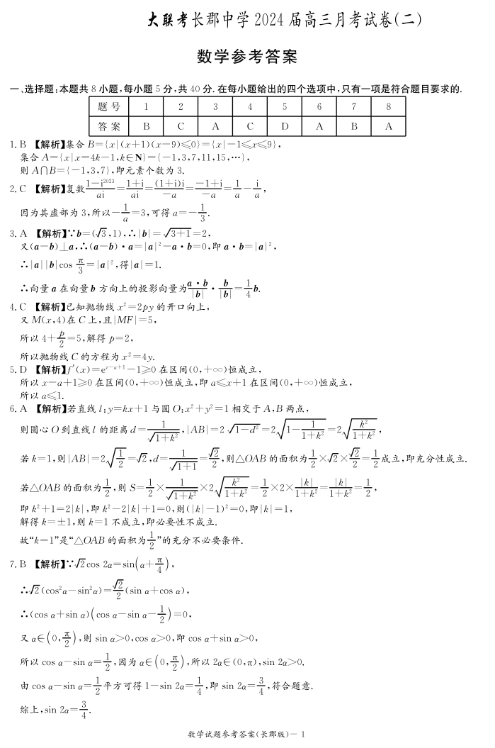 湖南省长沙市长郡中学2024届高三上学期月考卷(二)数学答案