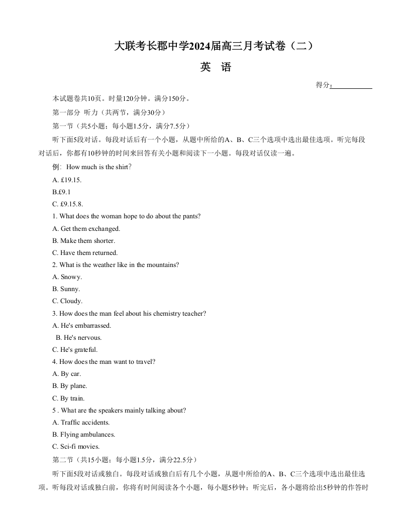 湖南省长沙市长郡中学2024届高三上学期月考卷(二)英语