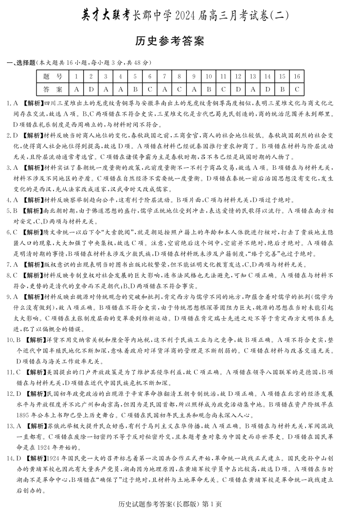 湖南省长沙市长郡中学2024届高三上学期月考卷(二)历史答案