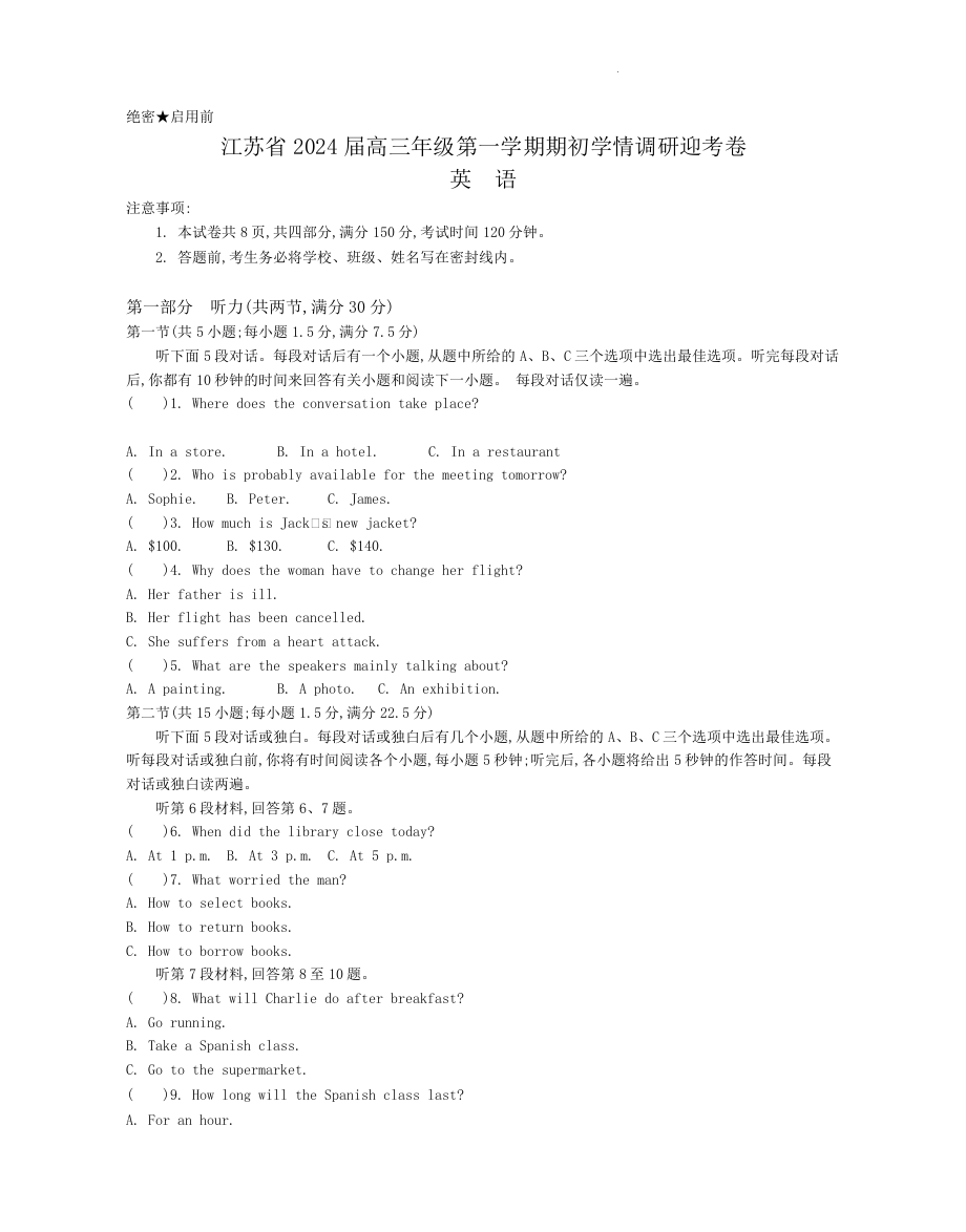江苏省2024届高三上学期期初学情调研迎考英语