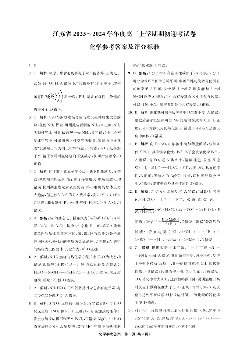 江苏省2024届高三上学期期初学情调研迎考化学答案