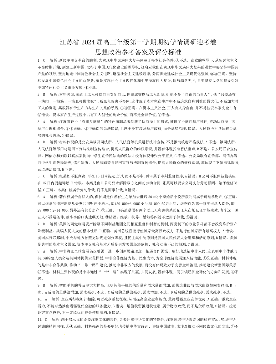 江苏省2024届高三上学期期初学情调研迎考政治答案
