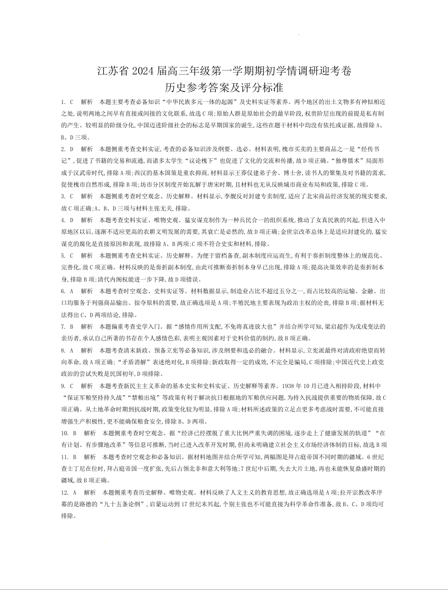 江苏省2024届高三上学期期初学情调研迎考历史答案
