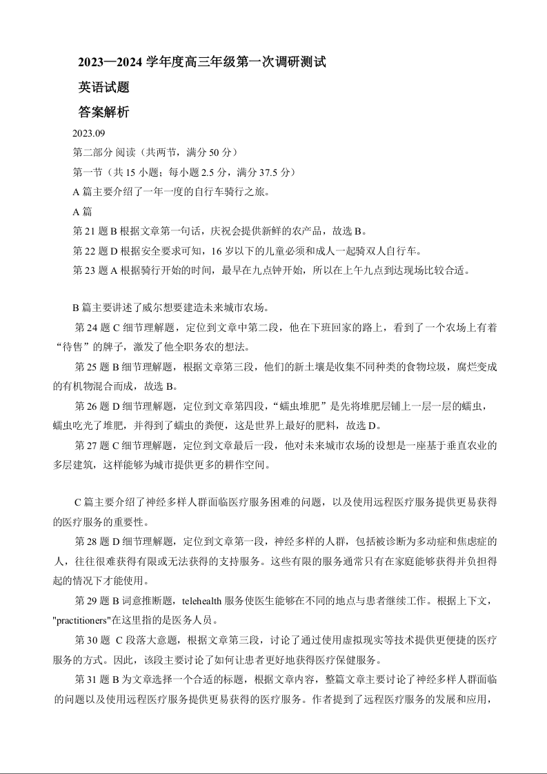 江苏省淮安市2024届高三上学期开学调研测试英语答案
