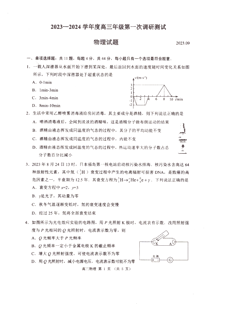 江苏省淮安市2024届高三上学期开学调研测试物理