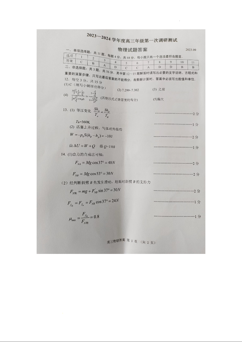 江苏省淮安市2024届高三上学期开学调研测试物理答案