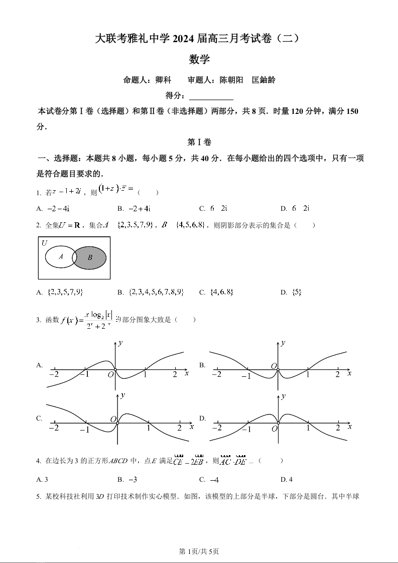 湖南省长沙市雅礼中学2024届高三上学期月考试卷(二))数学(原卷版)