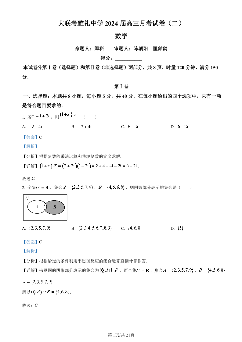 湖南省长沙市雅礼中学2024届高三上学期月考试卷(二)数学(精品解析版)