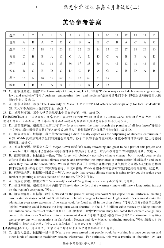 湖南省长沙市雅礼中学2024届高三上学期月考试卷(二)英语答案