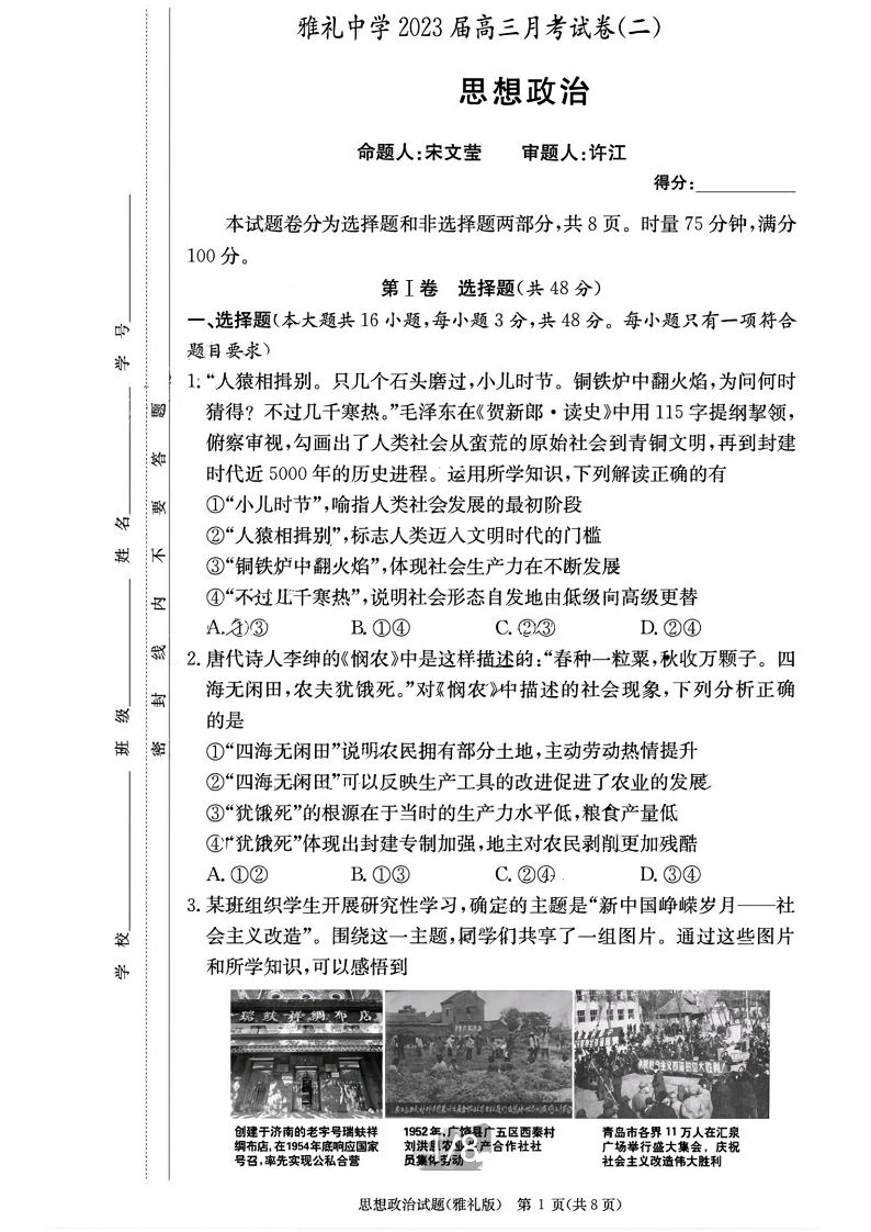 湖南省长沙市雅礼中学2024届高三上学期月考试卷(二)政治