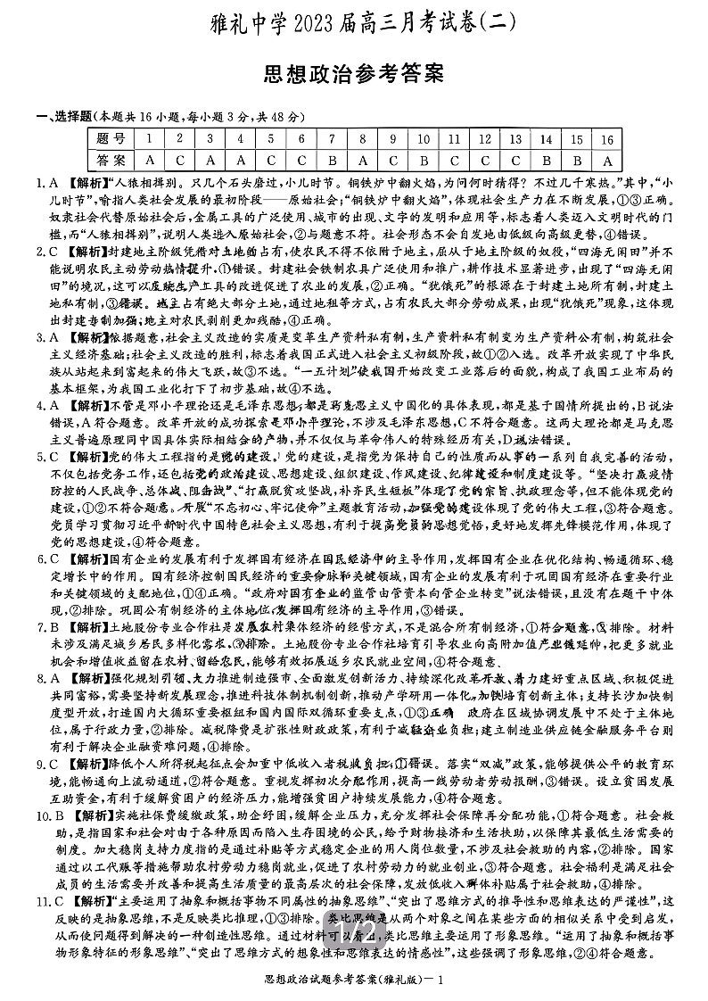 湖南省长沙市雅礼中学2024届高三上学期月考试卷(二)政治答案
