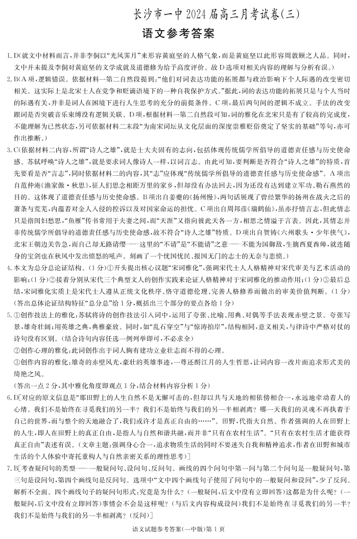 湖南省长沙市第一中学2024届高三上学期月考卷(三)语文答案