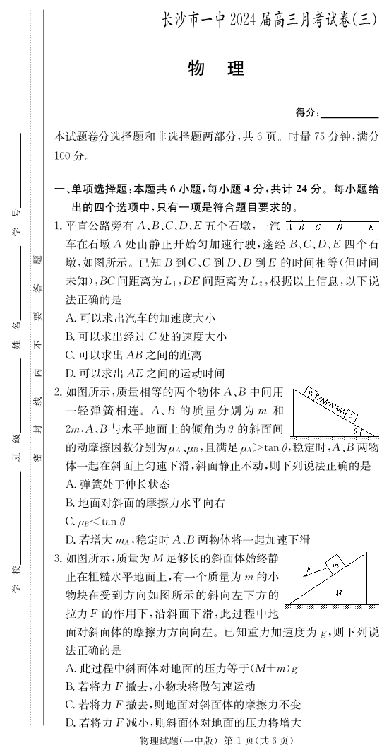 湖南省长沙市第一中学2024届高三上学期月考卷(三)物理
