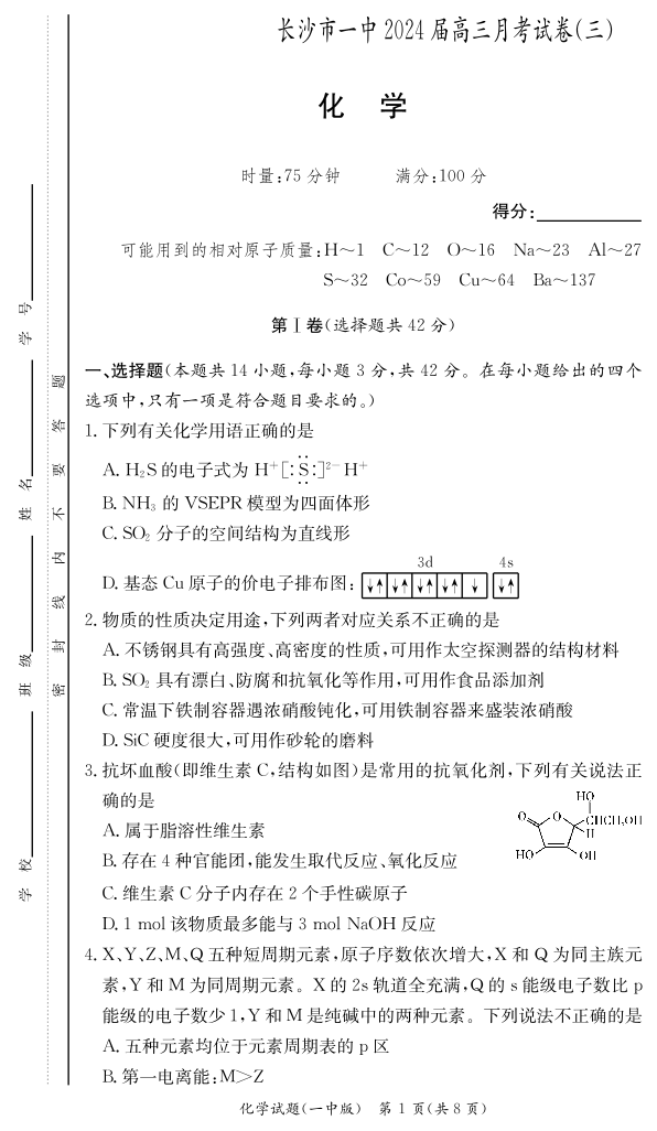 湖南省长沙市第一中学2024届高三上学期月考卷(三)化学