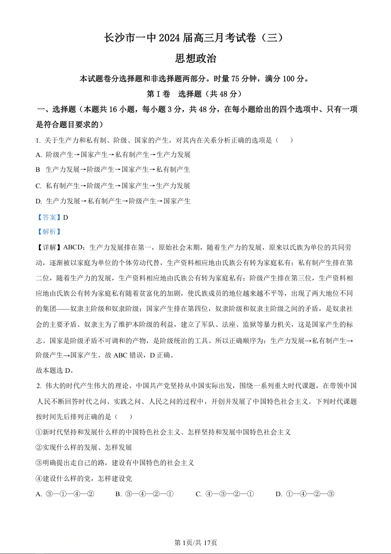 湖南省长沙市第一中学2024届高三上学期月考卷(三)政治(精品解析版)