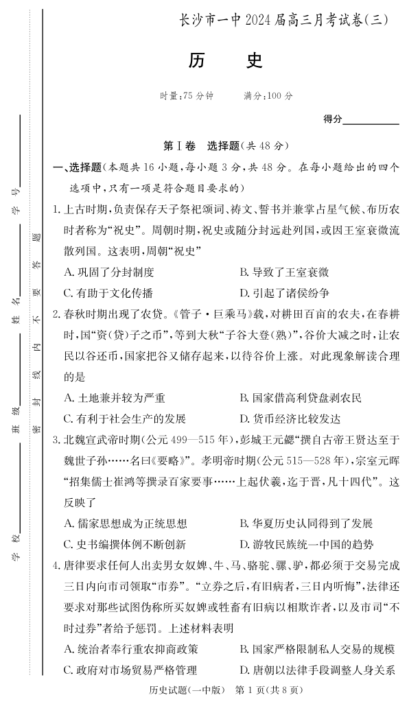 湖南省长沙市第一中学2024届高三上学期月考卷(三)历史