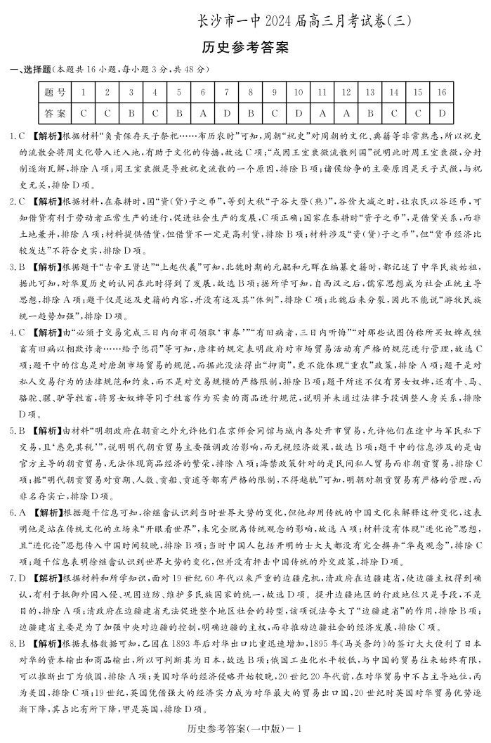 湖南省长沙市第一中学2024届高三上学期月考卷(三)历史答案