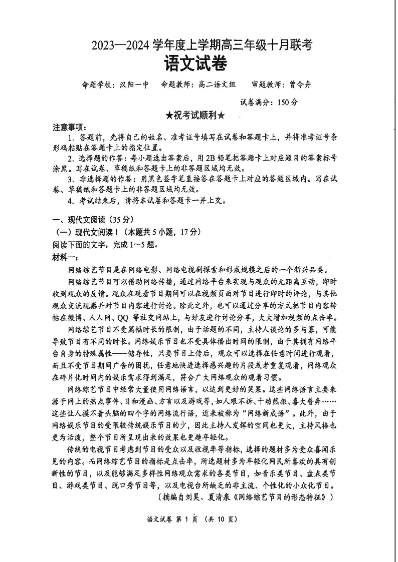 湖北省腾云联盟2024届上学期高三年级十月联考语文