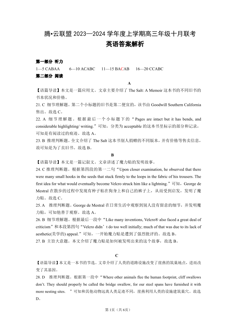 湖北省腾云联盟2024届上学期高三年级十月联考英语答案