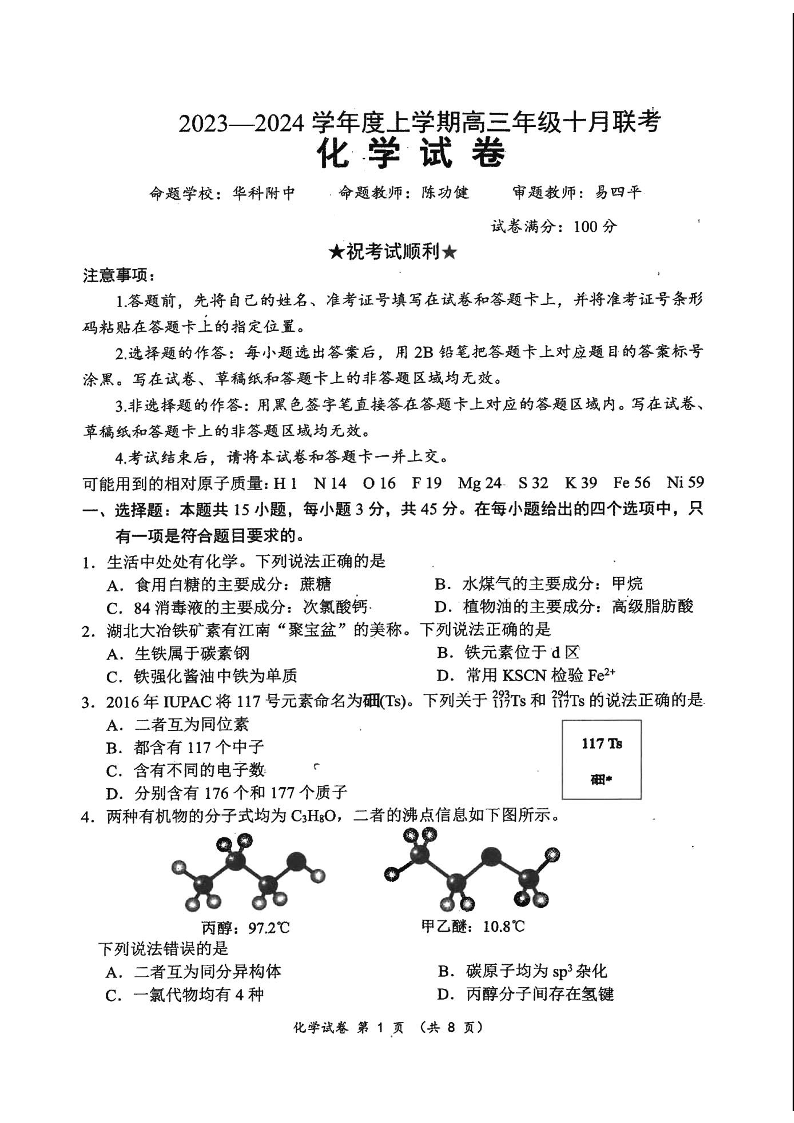 湖北省腾云联盟2024届上学期高三年级十月联考化学
