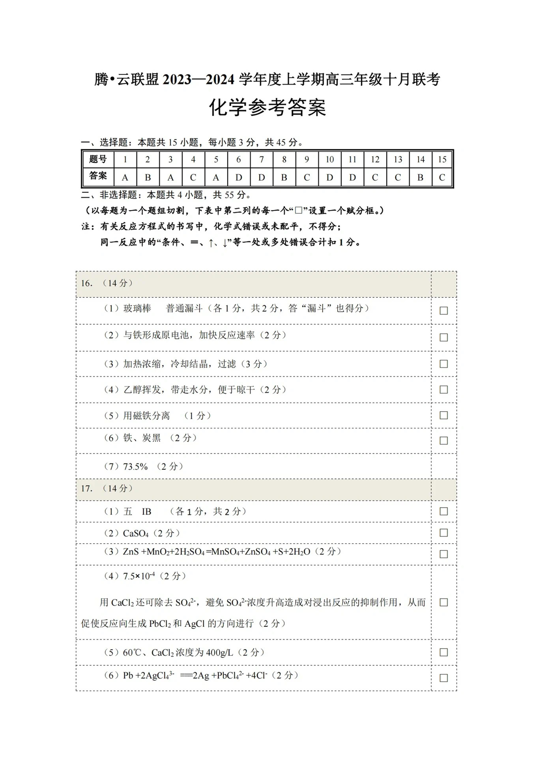 湖北省腾云联盟2024届上学期高三年级十月联考化学答案