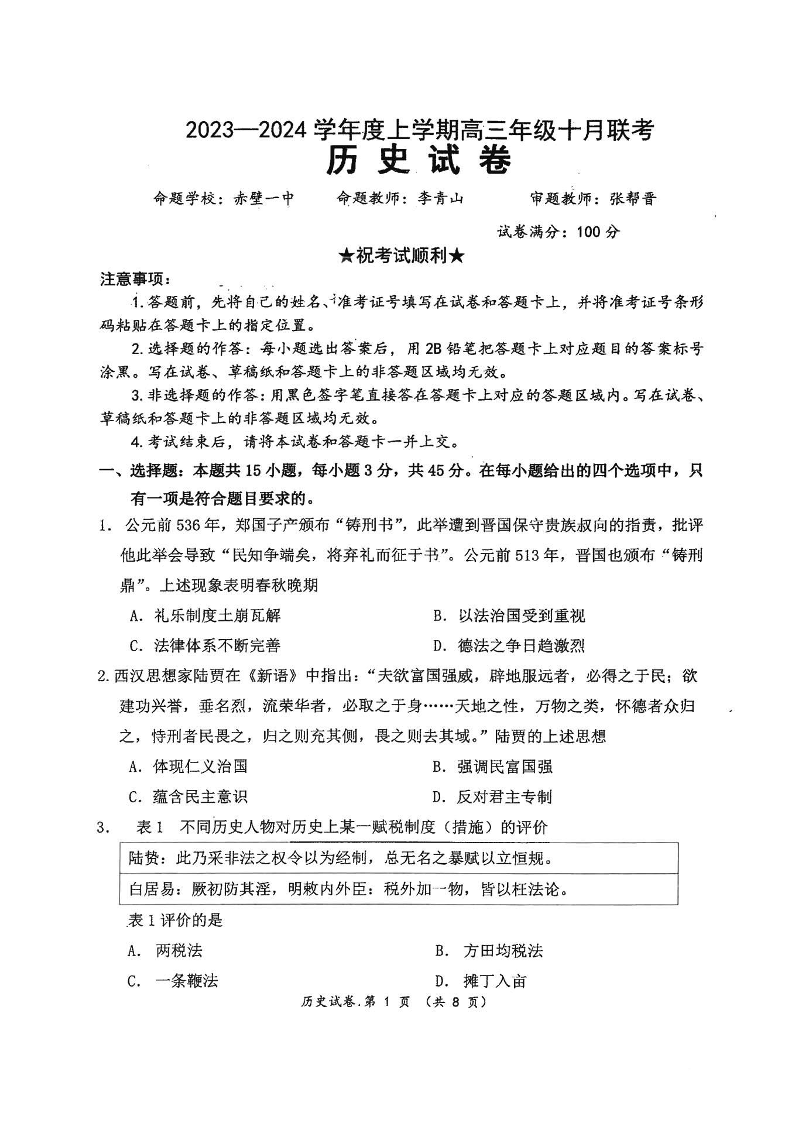 湖北省腾云联盟2024届上学期高三年级十月联考历史