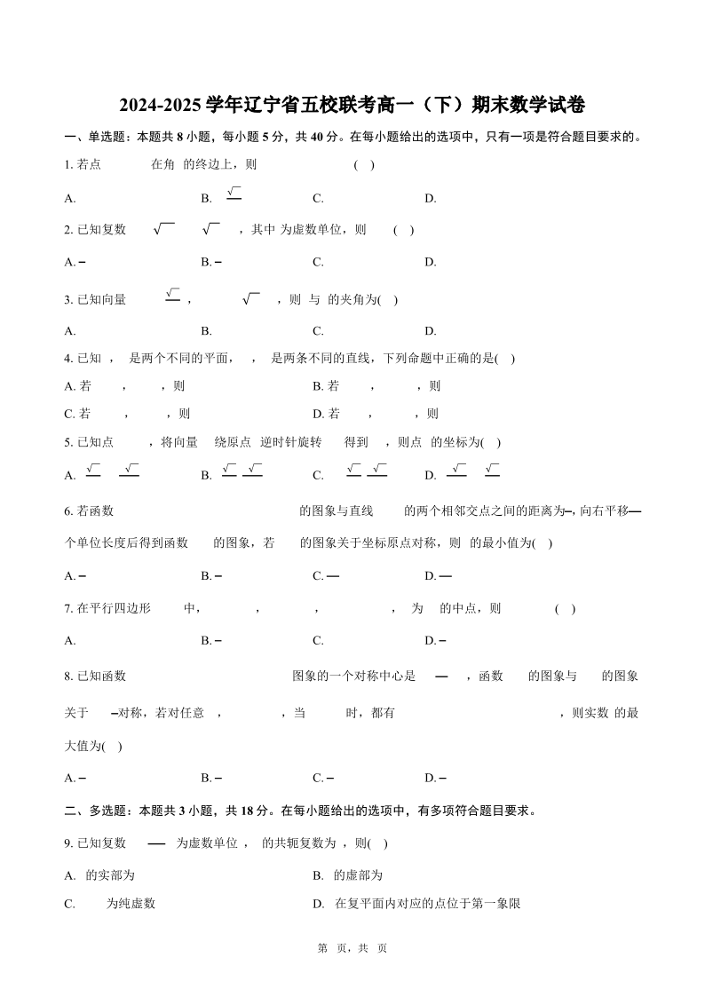 高一数学+答案--辽宁省五校联考2024-2025学年高一下学期7月期末考试