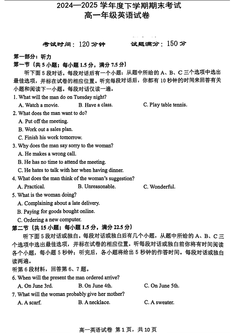 高一英语+答案--辽宁省五校联考2024-2025学年高一下学期7月期末考试