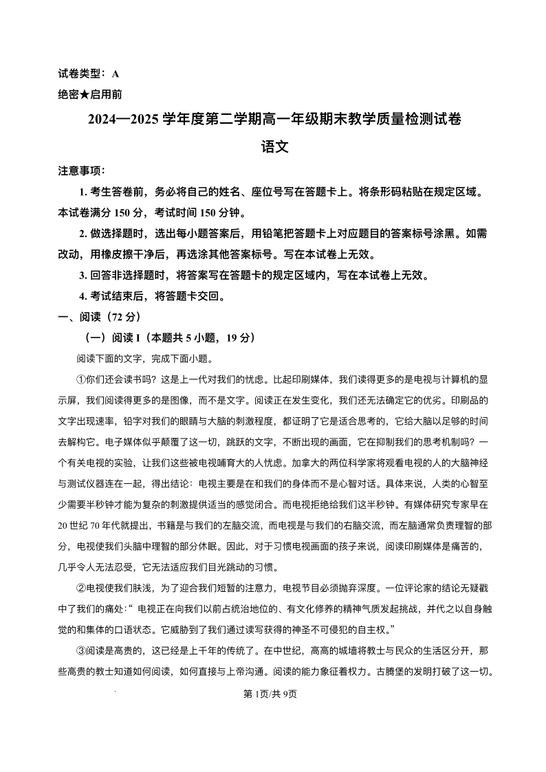 高一语文+答案--内蒙古自治区包头市2024-2025学年高一下学期期末教学质量检测试卷