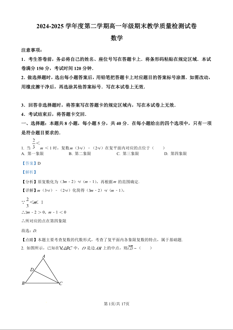 高一数学解析版--内蒙古自治区包头市2024-2025学年高一下学期期末教学质量检测试卷