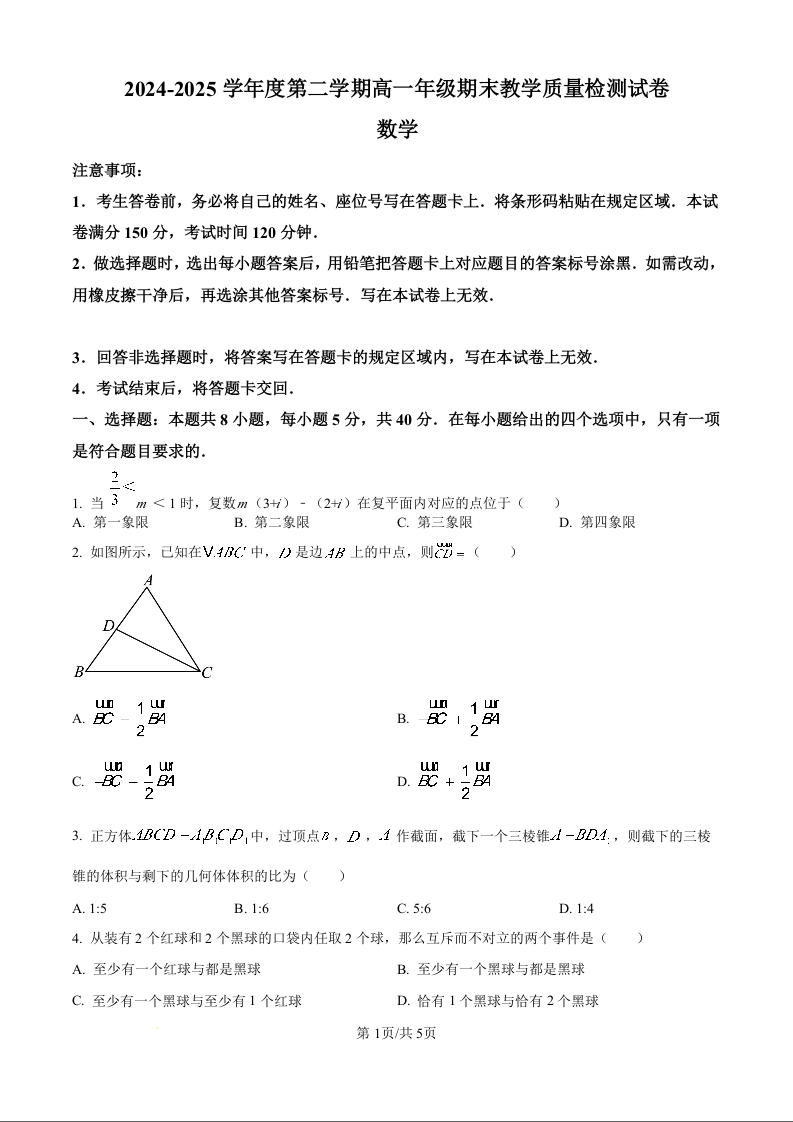 高一数学原版卷--内蒙古自治区包头市2024-2025学年高一下学期期末教学质量检测试卷