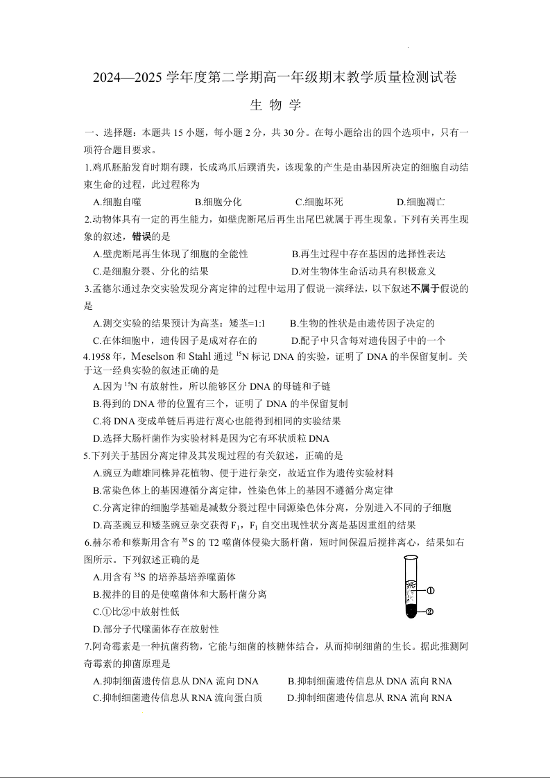 高一生物+答案--内蒙古自治区包头市2024-2025学年高一下学期期末教学质量检测试卷