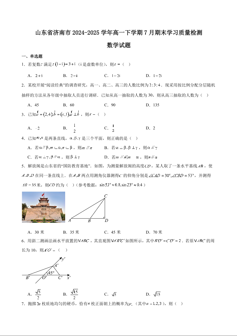 高一数学+答案--山东省济南市2024-2025学年高一下学期期末考试