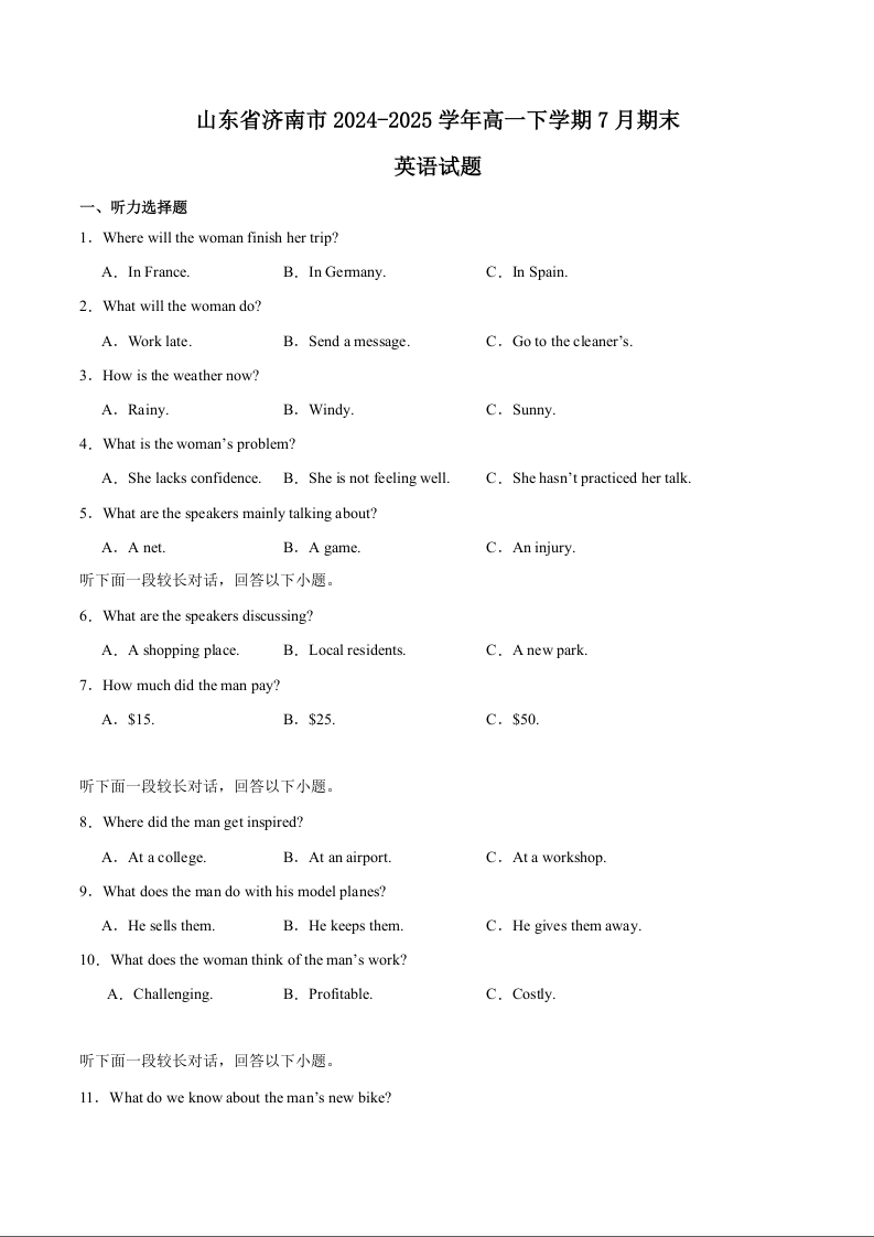 高一英语+答案--山东省济南市2024-2025学年高一下学期期末考试