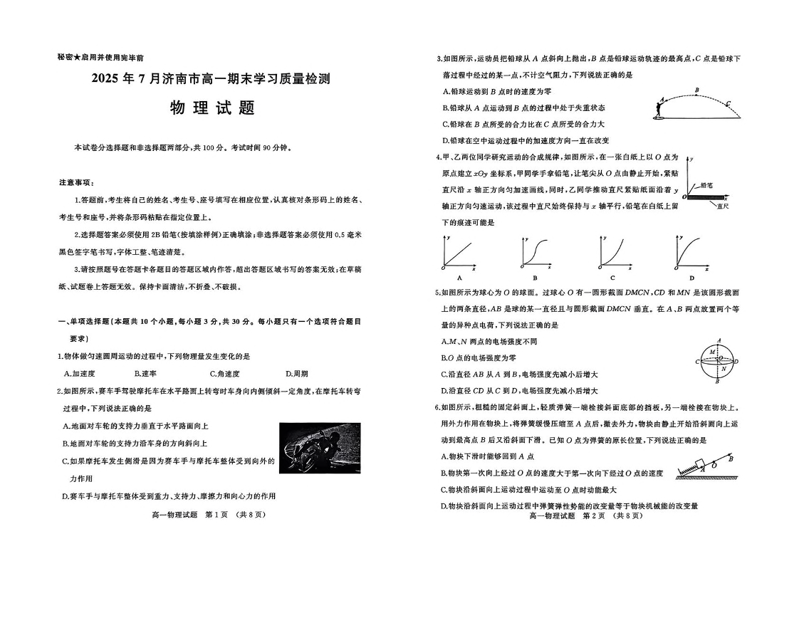 高一物理+答案--山东省济南市2024-2025学年高一下学期期末考试
