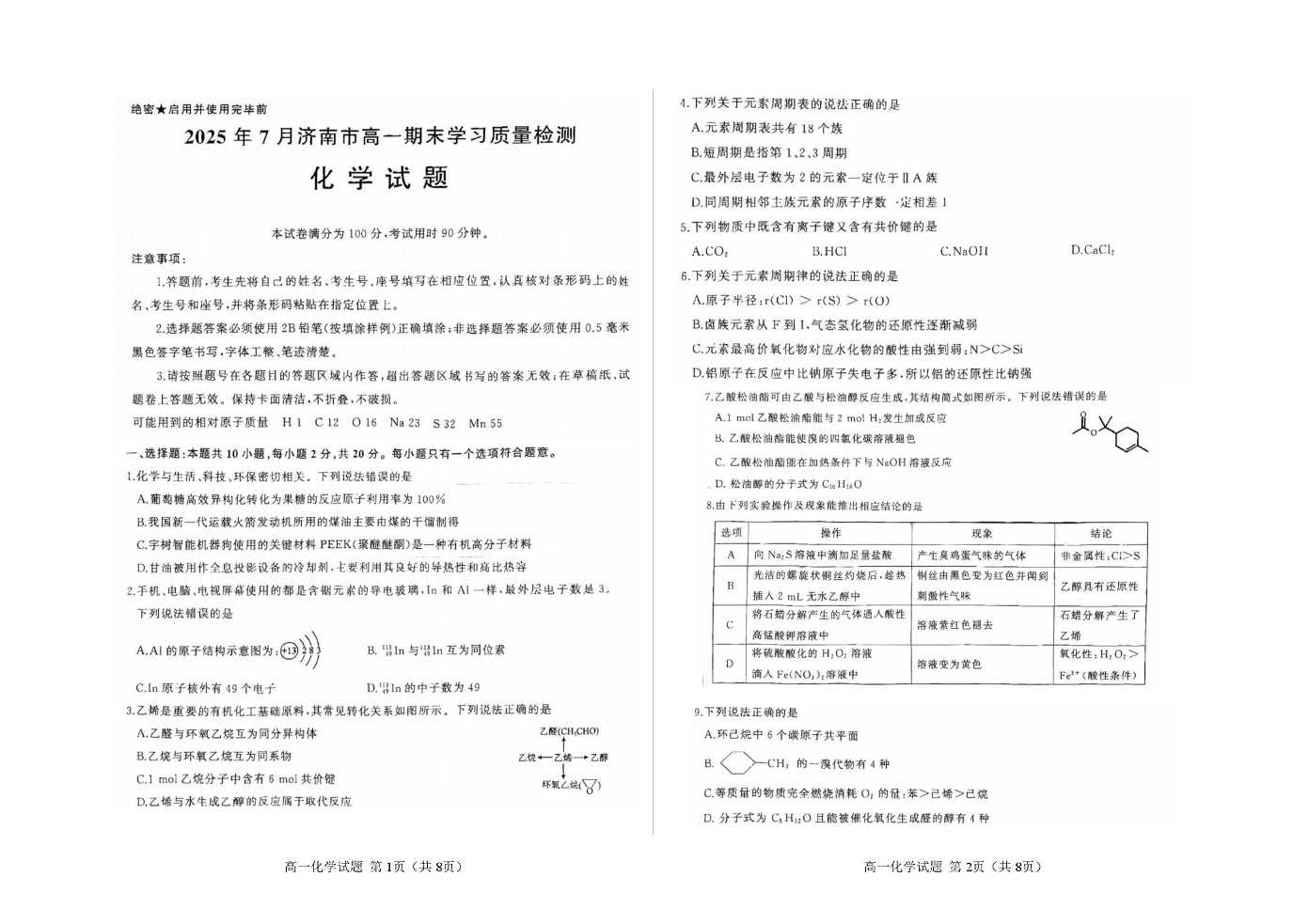 高一化学+答案--山东省济南市2024-2025学年高一下学期期末考试
