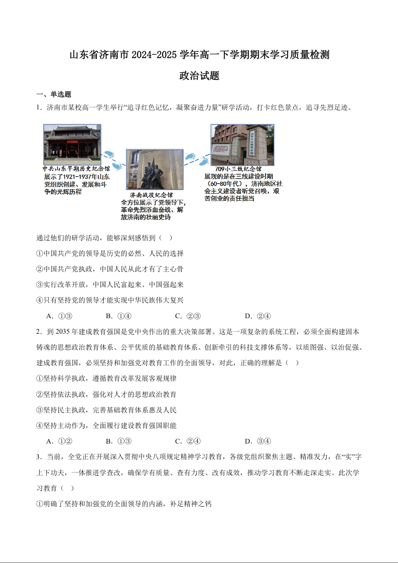高一政治+答案--山东省济南市2024-2025学年高一下学期期末考试