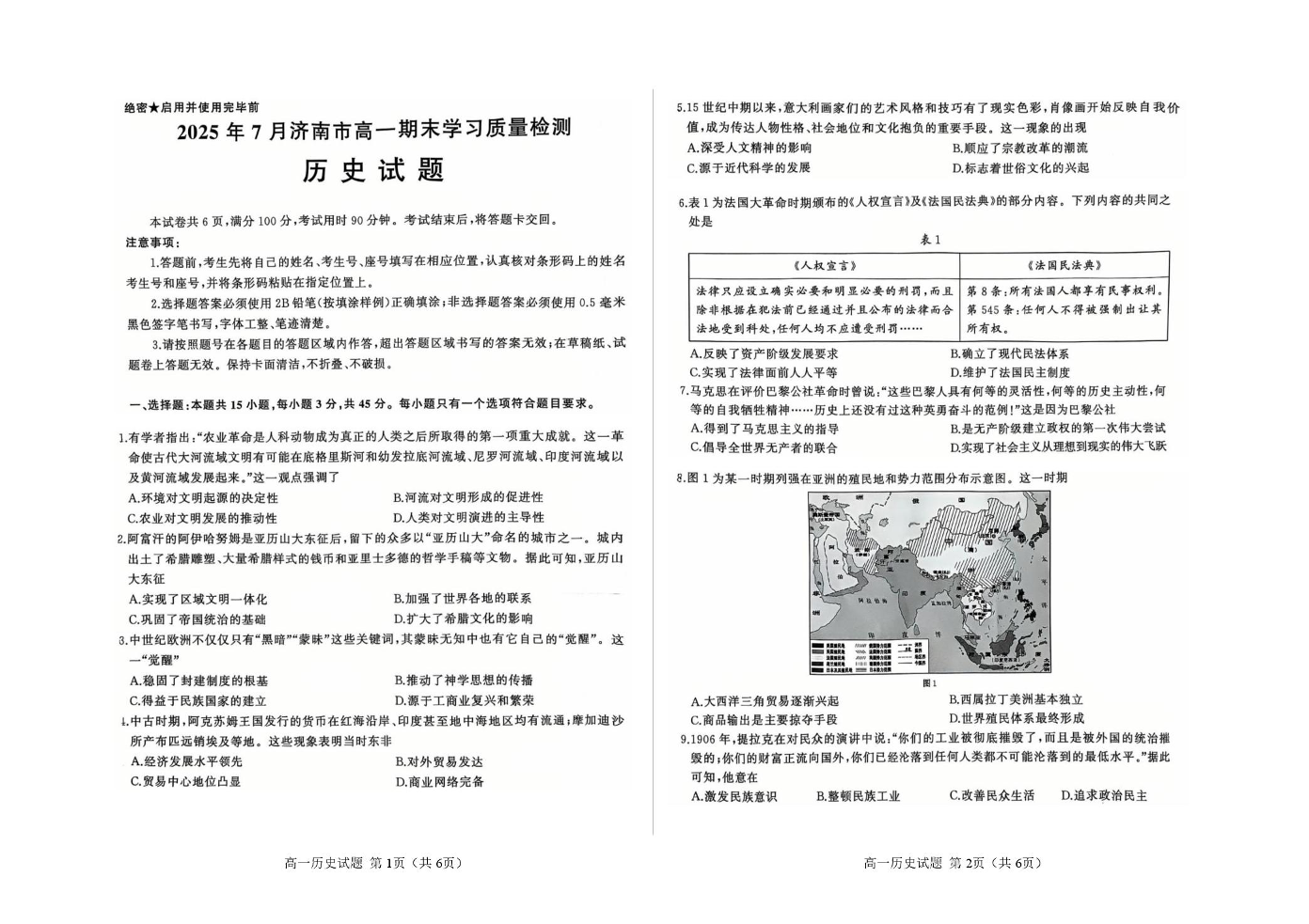 高一历史+答案--山东省济南市2024-2025学年高一下学期期末考试