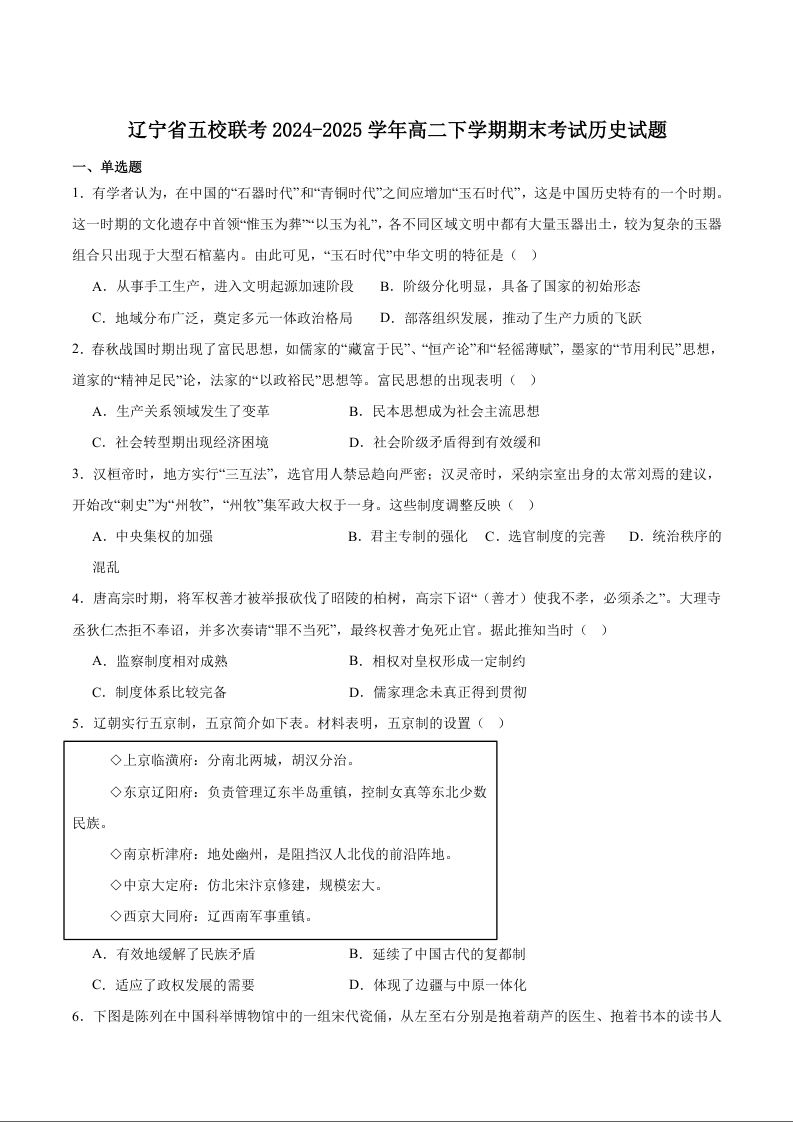高二历史+答案--辽宁省五校联考2024-2025学年高二下学期7月期末考试