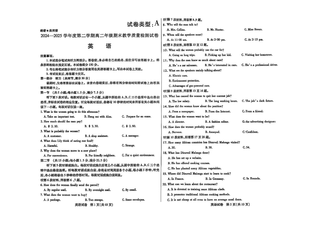 高二英语+答案--内蒙古自治区包头市2024-2025学年高二下学期期末教学质量检测试卷