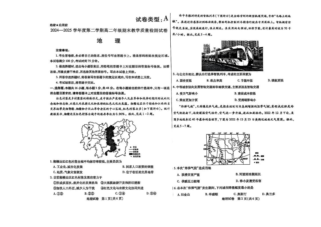 高二地理+答案--内蒙古自治区包头市2024-2025学年高二下学期期末教学质量检测试卷
