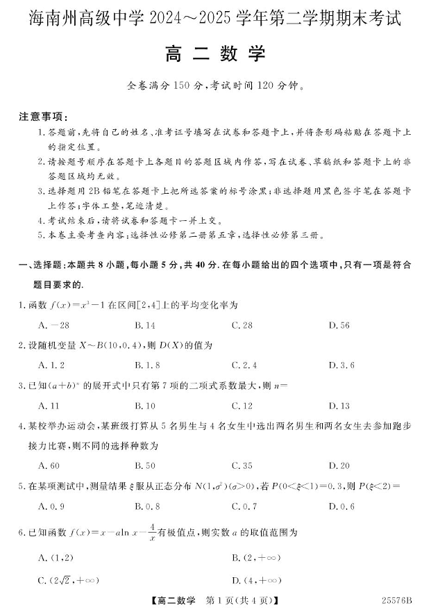 高二数学--青海省海南藏族自治州高级中学2024-2025学年高二下学期期末考试