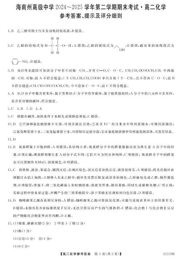 高二化学答案--青海省海南藏族自治州高级中学2024-2025学年高二下学期期末考试