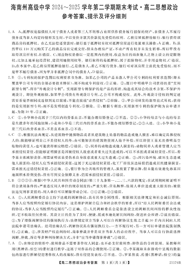 高二政治答案--青海省海南藏族自治州高级中学2024-2025学年高二下学期期末考试