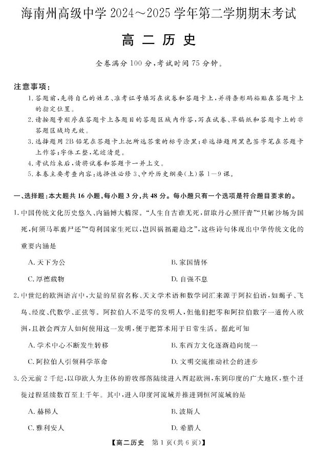高二历史+答案--青海省海南藏族自治州高级中学2024-2025学年高二下学期期末考试