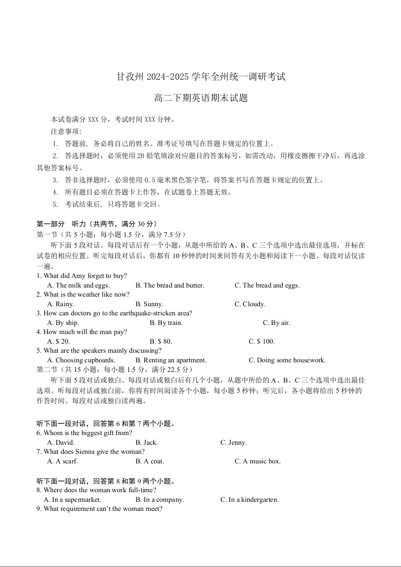 高二英语+答案--四川省甘孜藏族自治州2024-2025学年高二下学期7月期末全州统一调研考试