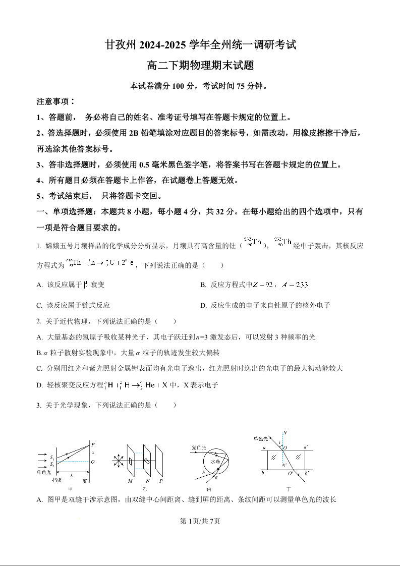 高二物理原卷版--四川省甘孜藏族自治州2024-2025学年高二下学期7月期末全州统一调研考试